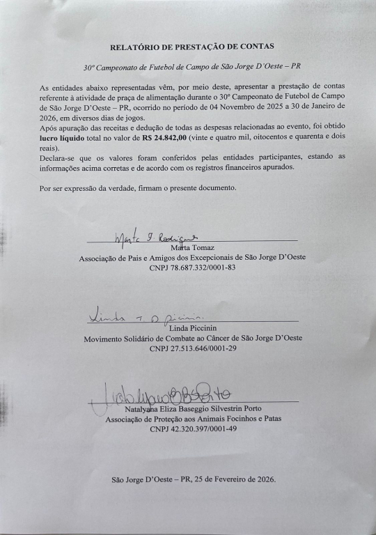 O lucro líquido total obtido foi de R$ 24.842,00, valor que será partilhado igualmente entre as três instituições participantes