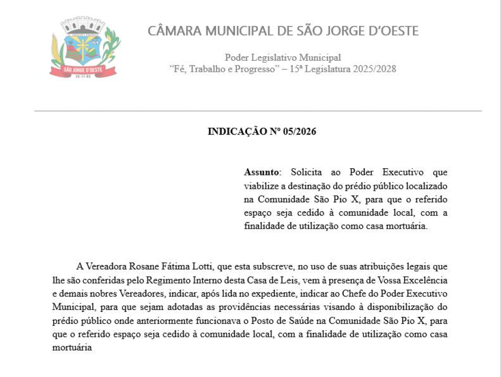 A Indicação nº 05/2026, de autoria da vereadora Rosane Fátima Lotti, foi apresentada em plenário no dia 16 de março de 2026 e conta com o apoio de outros oito parlamentares.